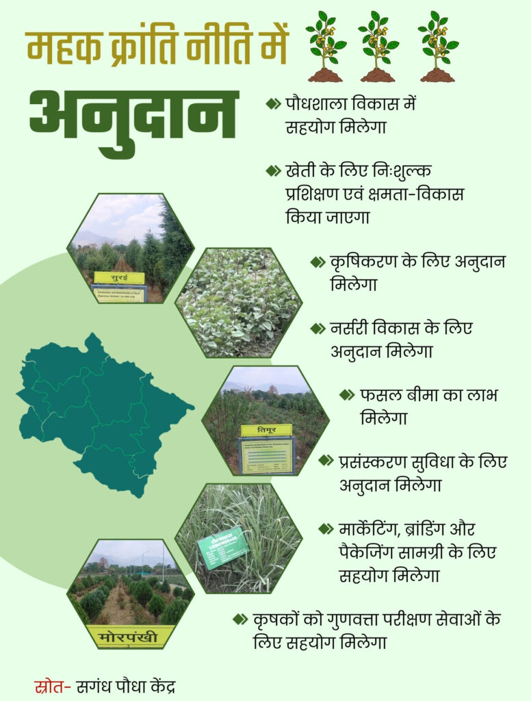 प्रदेश सरकार द्वारा एरोमैटिक फार्मिंग के टर्नओवर को 1,179 करोड़ तक ले जाने का लक्ष्य रखा गया है. सरकार किसानों को एक हेक्टेयर भूमि पर खेती करने पर 80 फीसदी की सब्सिडी देगी. एक हेक्टेयर से अधिक भूमि पर खेती करने पर किसानों को 50 फीसदी की सब्सिडी मिलेगी. योजना के पहले चरण में 7 एरोमा वैलियों को विकसित किया जाएगा.